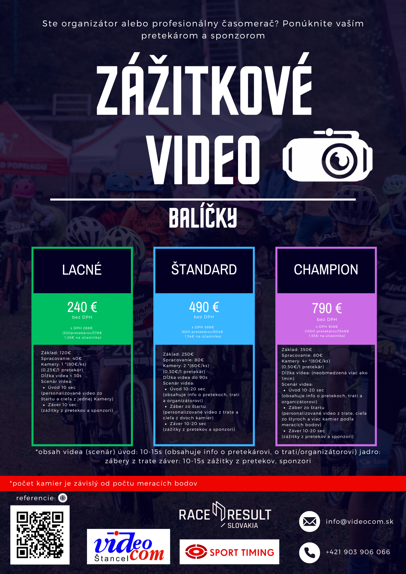 Hľadáte jedinečný a inovatívny spôsob, ako obohatiť zážitky športovcov a zároveň zvýšiť atraktivitu pre sponzorov? Zážitkové video je tu pre vás! Ponúkame vám možnosť zachytiť športové výkony z rôznych uhlov pomocou kamier strategicky rozmiestnených po trati. Vďaka tomu získate jedinečný a multiperspektívny pohľad na aktivity vašich športovcov, ktorý im umožní prežiť ich znovu a znovu s maximálnou intenzitou a zároveň poslúži ako pútavý materiál pre sponzorov.